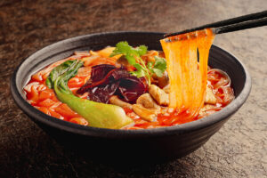 麻辣湯に使っているもちもちの平麺は本格的なさつまい麺。中華麺とも緑豆春雨とも異なるもちもちのつるんとした食感&喉越しは唯一無二!